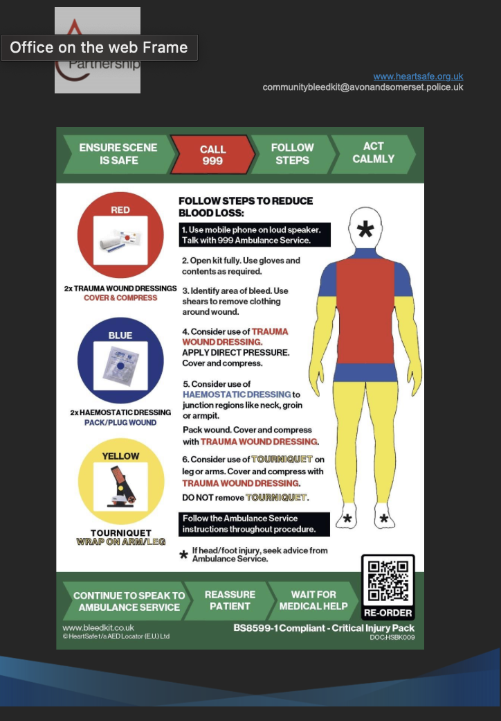Community Bleed Kit now available next to the defibrillator at Batheaston Village Hall with thanks to Avon and Somerset Police